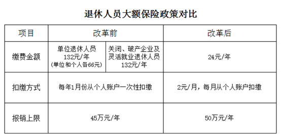 为了减轻退休人员缴费负担,大额医疗保险费用从132元/年降至24元/年,每月从个人账户扣缴2元。同时提高大额保险年最高报销额度,从改革前的45万元提高到50万元。